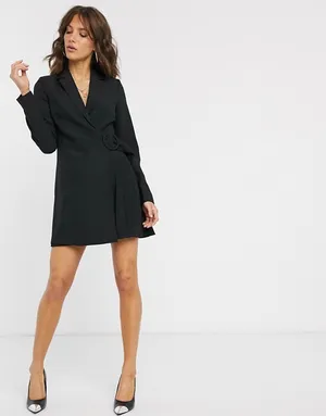 Это черное платье-пиджак совсем не ассоциируется у нас с деловым стилем, ведь смотрится оно по-вечернему. Предлагаем тебе надеть его с черными босоножками, застегивающимися на щиколотке, и дополнить образ длинными серьгами-цепочками.