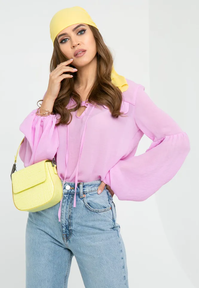 Воздушная розовая блуза станет отличной основой яркого летнего образа. Дополни ее желтыми или зелеными шортами, пестрой банданой и небольшой плетеной сумкой.