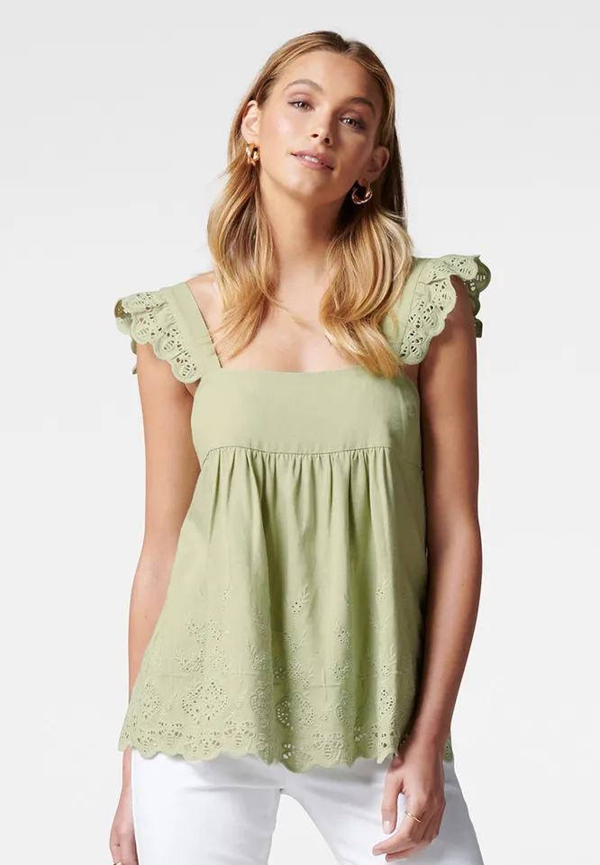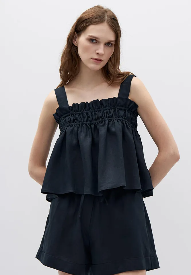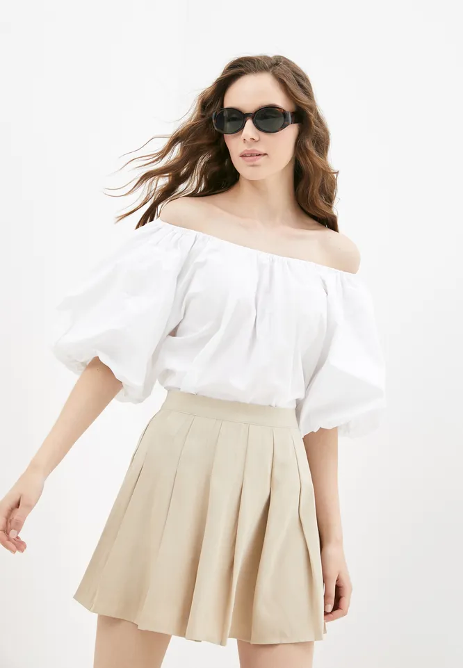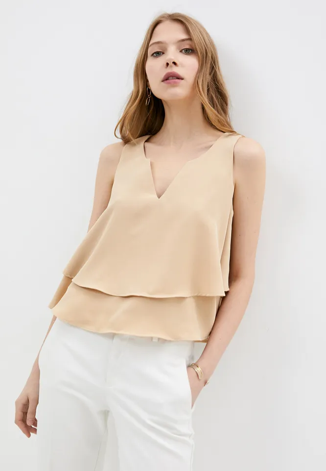 Бежевый топ А-силуэта легко впишется как в повседневные, так и в офисные образы. Предлагаем носить его с шортами-бермудами или плиссированной юбкой миди.