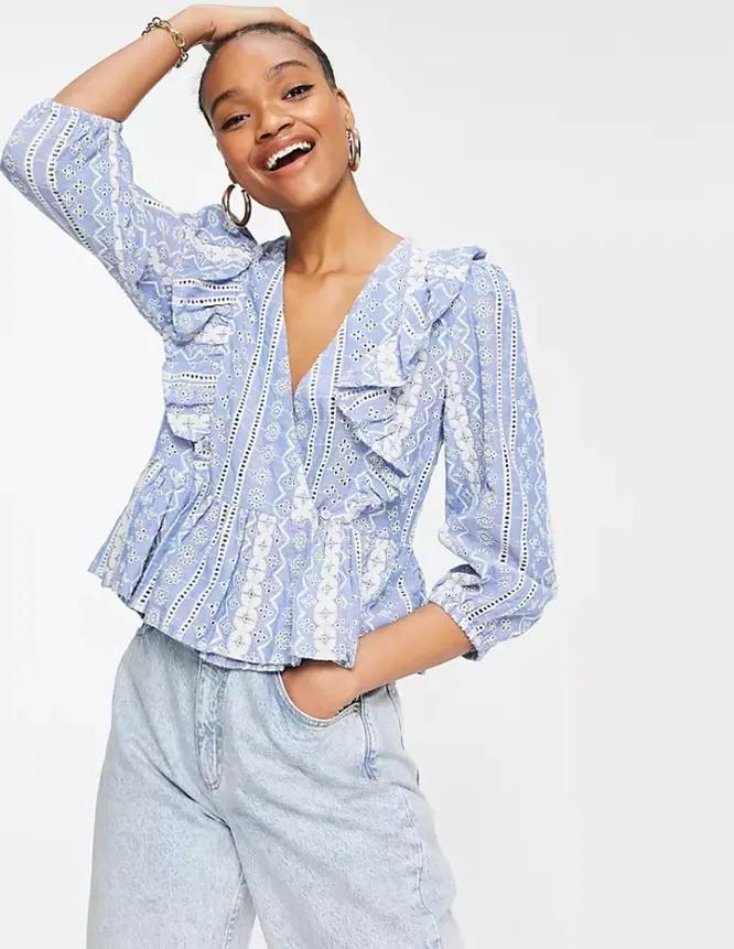Блуза с запахом, небольшой баской и оборками поможет создать выразительный casual-образ. Модель стильно смотрится с расклешенными брюками или укороченными прямыми джинсами.