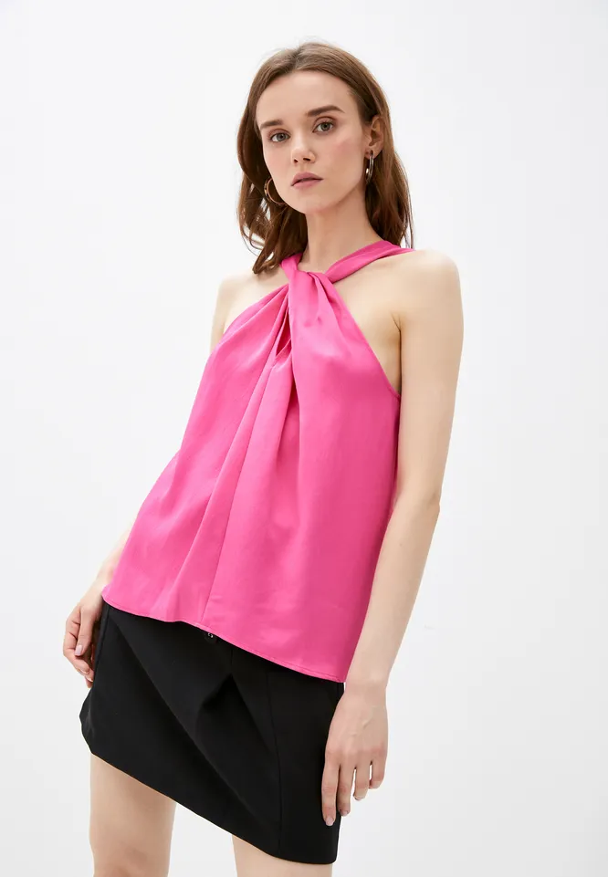 Если хочешь добавить образу красок, выбирай ярко-розовый топ с воротником халтер. Он одинаково хорошо сочетается как с нейтральными, так и с акцентными остромодными вещами.