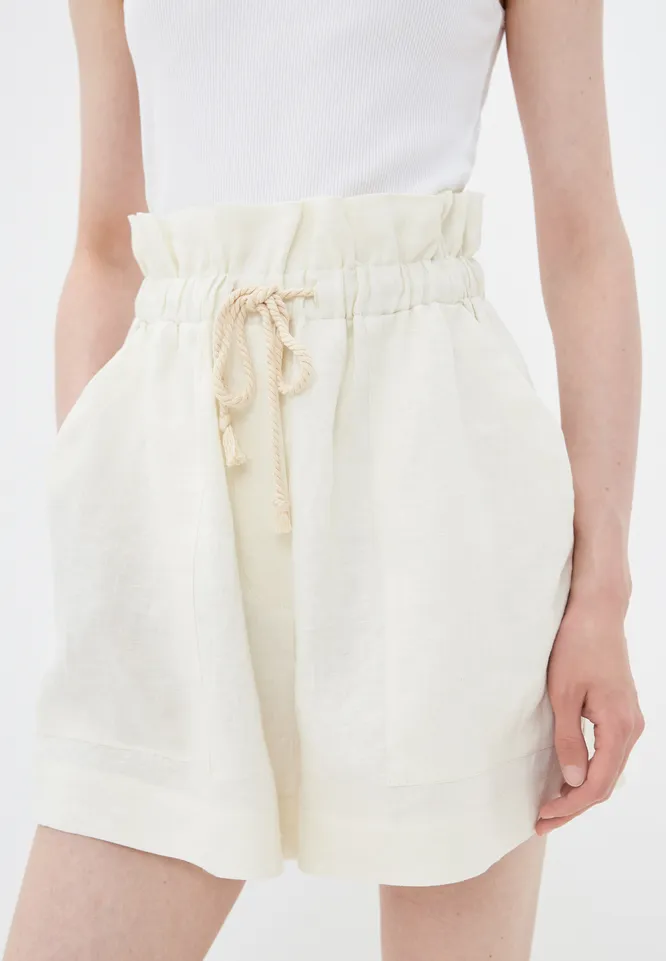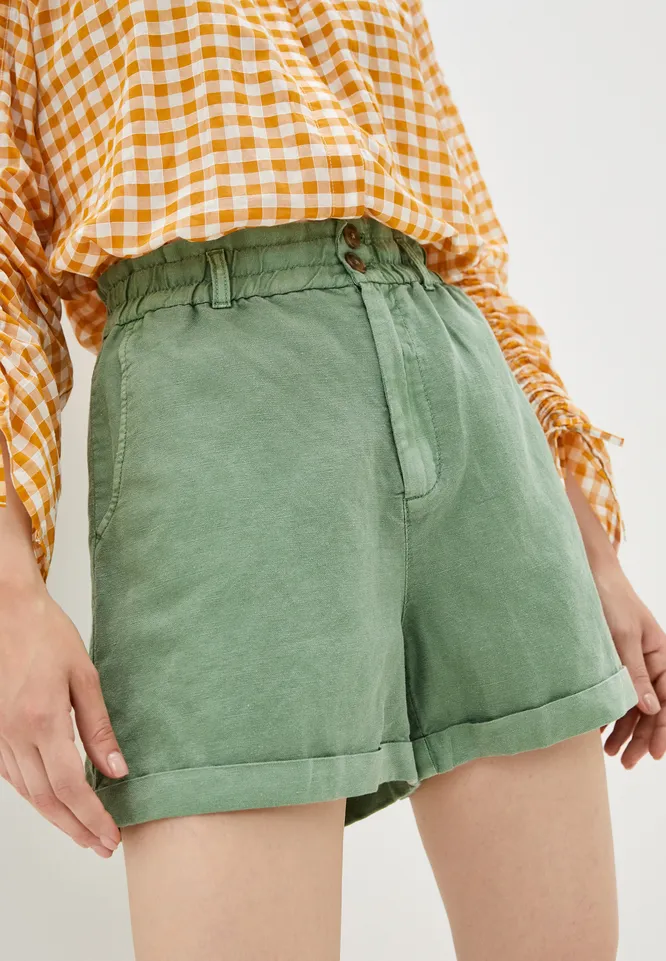 Для пляжных образов подойдут легкие льняные шорты на резинке цвета хаки. Дополняй их укороченным топом, банданой и соломенной сумкой.