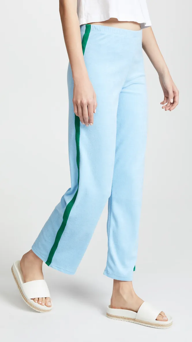 Не стоит забывать и про пастельную гамму — брюки нежно-голубого цвета с контрастными зелеными лампасами легко возьмут на себя роль акцента в любом образе.