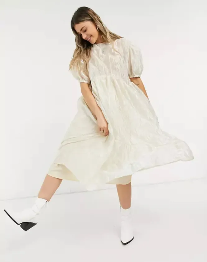 Если хочешь создать стильный романтичный образ, выбирай объемное жаккардовое платье с рукавами-фонариками. Оно одинаково хорошо смотрится и с босоножками, и с туфлями, и с белыми кедами.