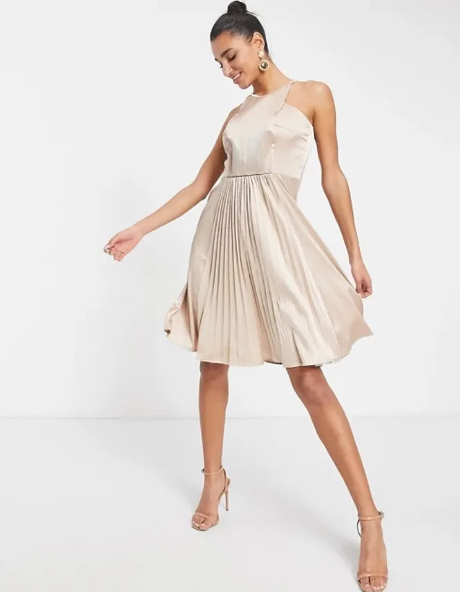 Добавь к этому платью бежевые босоножки, изящное украшение для волос и аккуратные серьги — нежный образ для школьного вечера готов!