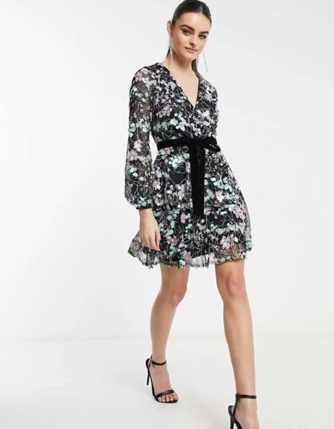 Платье из полупрозрачной ткани с цветочным принтом и пайетками даже не нужно дополнять аксессуарами: оно и так достаточно нарядное. Платье органично сочетается с простой укладкой или гладкой прической и минималистичными кожаными босоножками.