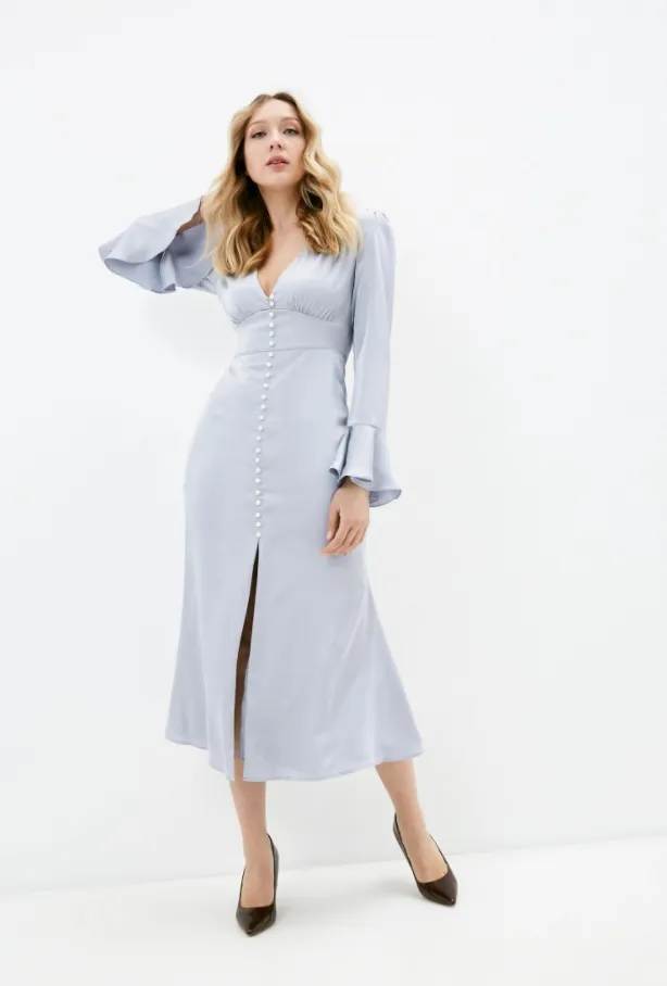 Лаконичное голубое платье подчеркнет фигуру. Можно дополнить его как яркими и акцентными аксессуарами, так и чем-то нейтральным.
