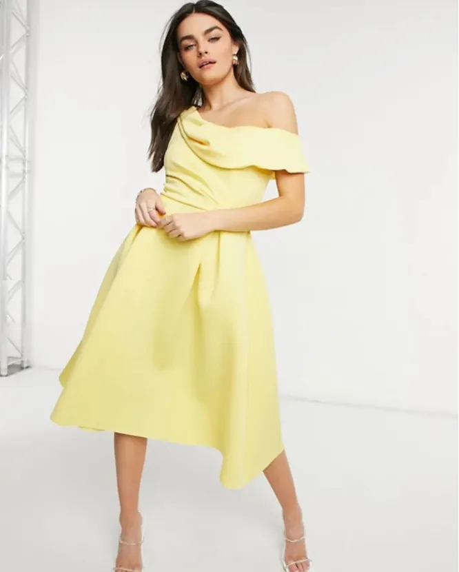 Лимонное платье с драпировкой и открытыми плечами сочетай с серебристыми босоножками, яркими украшениями и сумочкой контрастного цвета (например, насыщенного зеленого).