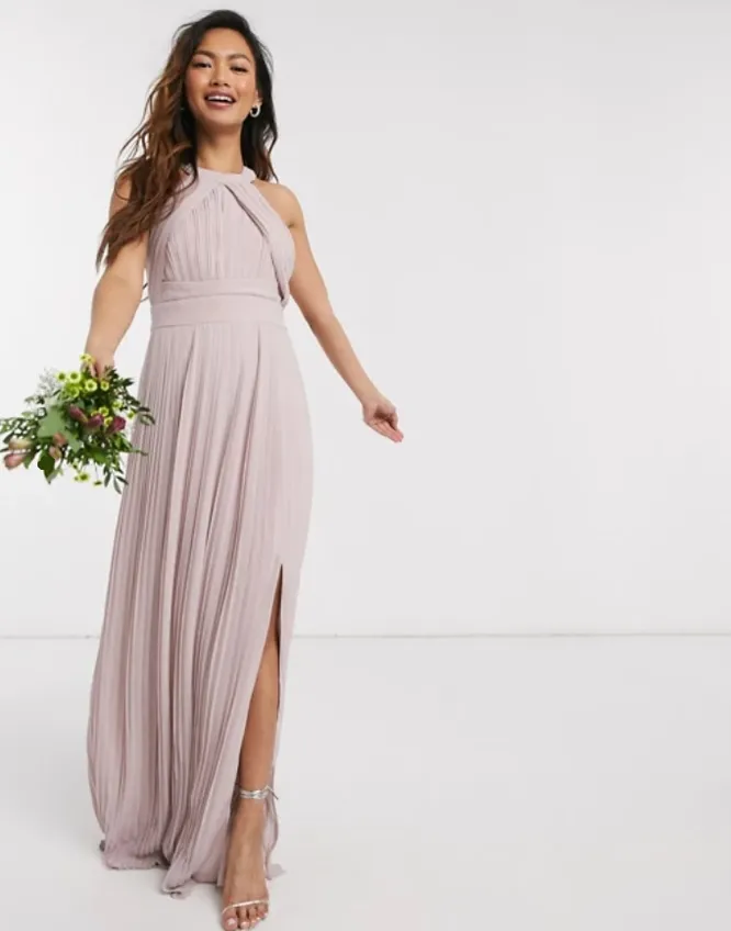 Летящее платье в пол пыльно-розового цвета красиво смотрится с блестящими босоножками, нарядным клатчем и легкой «пляжной» укладкой.