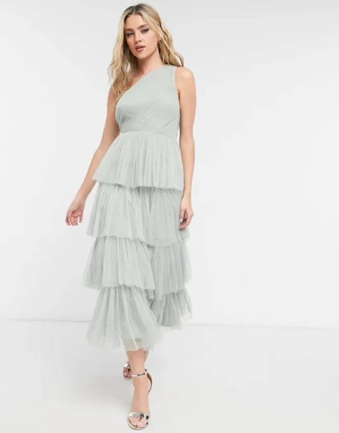 Если хочешь что-то нарядное, но не слишком помпезное, присмотрись к шалфейно-зеленому платью из тюля с ярусной юбкой.