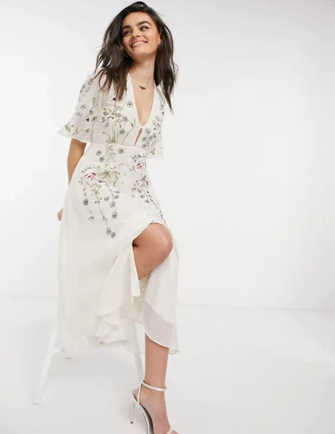 Легкое чайное платье с цветочной вышивкой станет отличной основой для образа в стиле бохо. Дополни его многослойным колье, коричневыми замшевыми босоножками и ободком, декорированным искусственными или живыми цветами.
