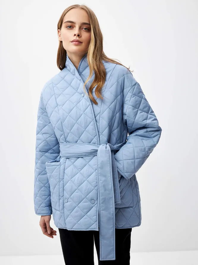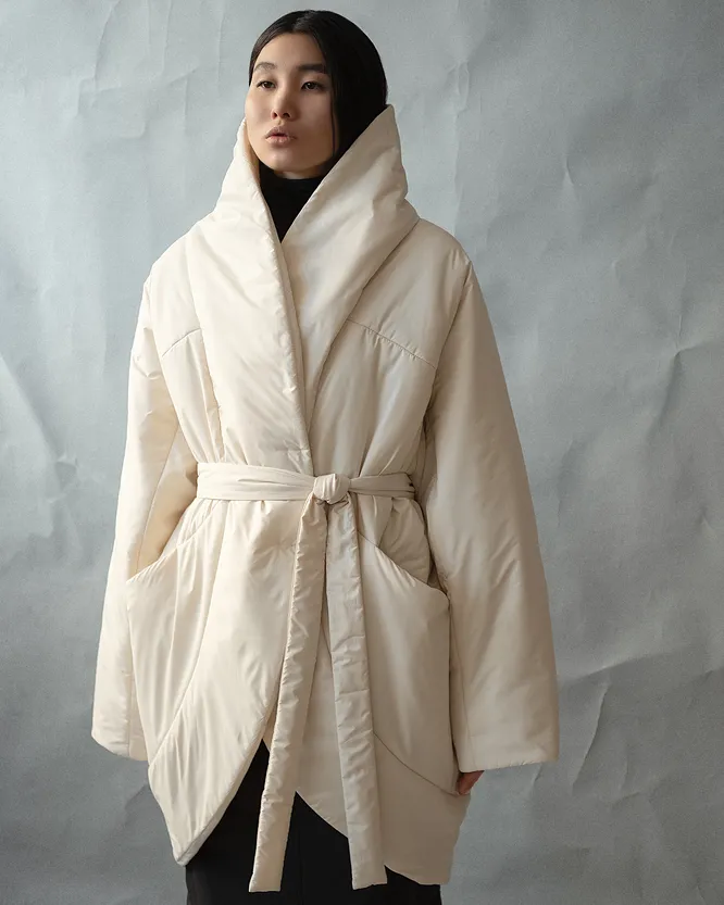 Потому что помимо самых базовых стеганых моделей без ворота (обычно это куртки на кнопках) есть еще несколько весьма и весьма интересных вариаций. Одни из наших любимых — «кимоно», пошитые в восточном стиле, с поднятым воротом и поясом.
