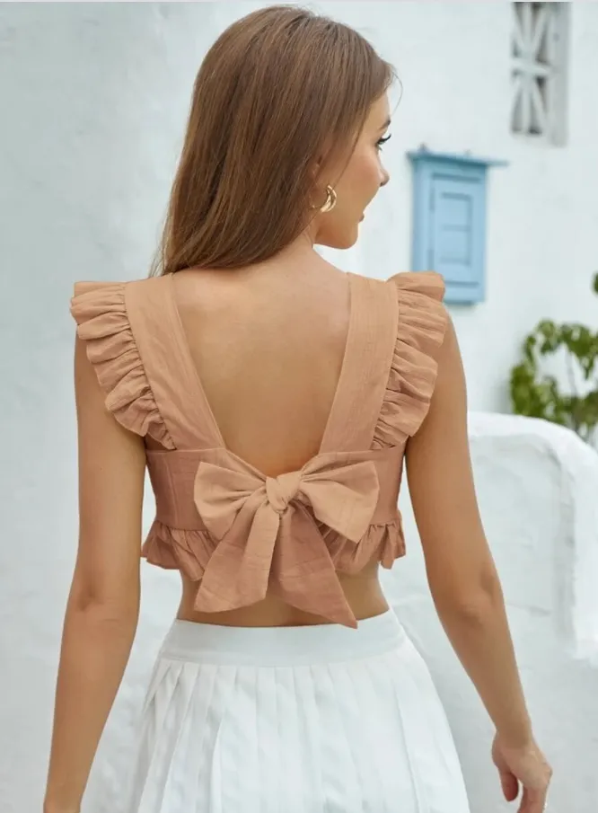 Нейтральный бежевый топ с бантом на спинке можно носить с белыми широкими брюками, летящими юбками с цветочным принтом или шортами с высокой посадкой.