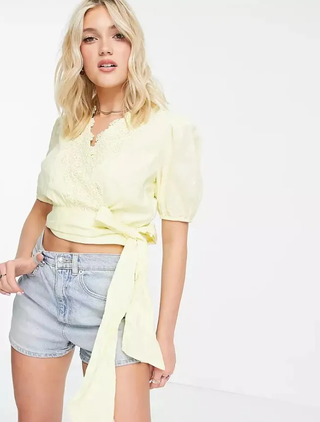 Красиво и женственно смотрится лимонный топ с запахом. Он выгодно подчеркнет талию и визуально удлинит шею.