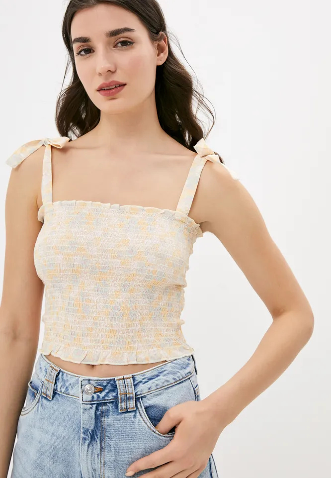 Базовая модель на каждый день. Ненавязчивый акварельный принт, нейтральные оттенки, милые бантики на бретелях — этот топ легко впишется в любой лук.