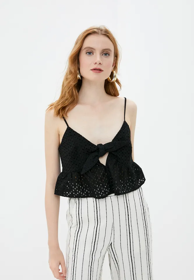 Черный топ на тонких бретелях лучше всего смотрится с брюками, юбками и джинсами свободного кроя и высокой талией.