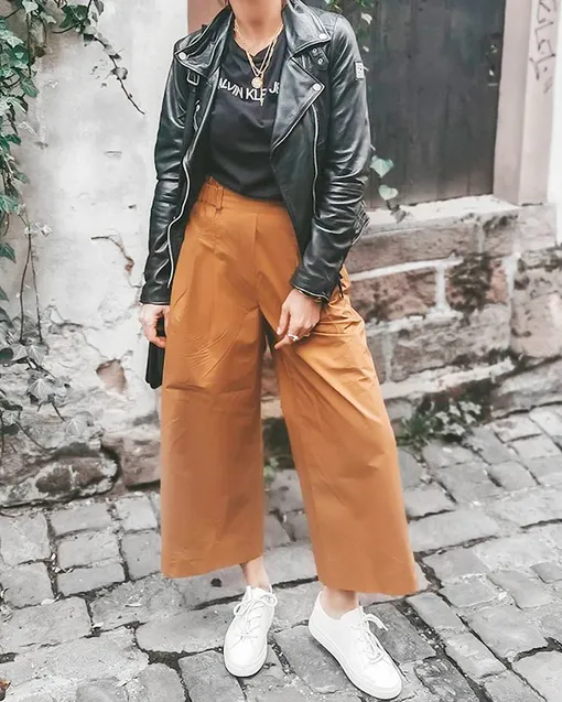 Кюлоты требуют благородства и «чистого» образа, поэтому дополняй их объемными свитерами или нежными блузами свободного кроя. Из обуви выбирай классические лодочки или лоферы, а из верхней одежды — объемную кожаную куртку или оверсайз-блейзер для создания эффекта небрежности.