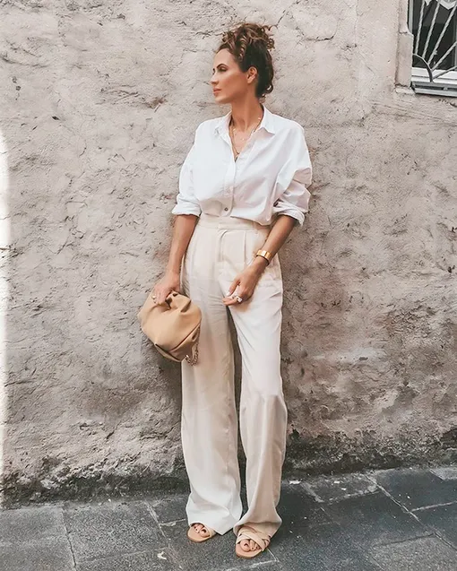 Брюки палаццо — идеальный вариант для создания женственного образа. Их можно сочетать как с облегающим верхом, так и со свободной рубашкой или кардиганом. Для более расслабленного лука заправь верх за пояс и дополни ремнем.