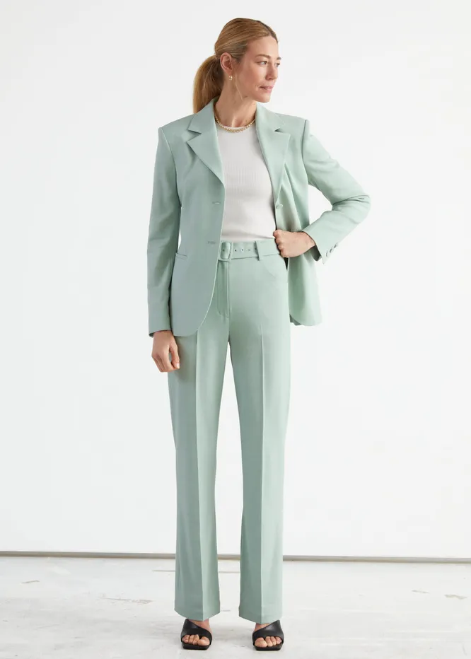 Ментоловые прямые брюки легко впишутся как в летние, так и в осенние луки. В первом случае носи их с романтичным топом в цветочек и изящными босоножками на каблуке, во втором — с классическими лодочками и строгой рубашкой или водолазкой.