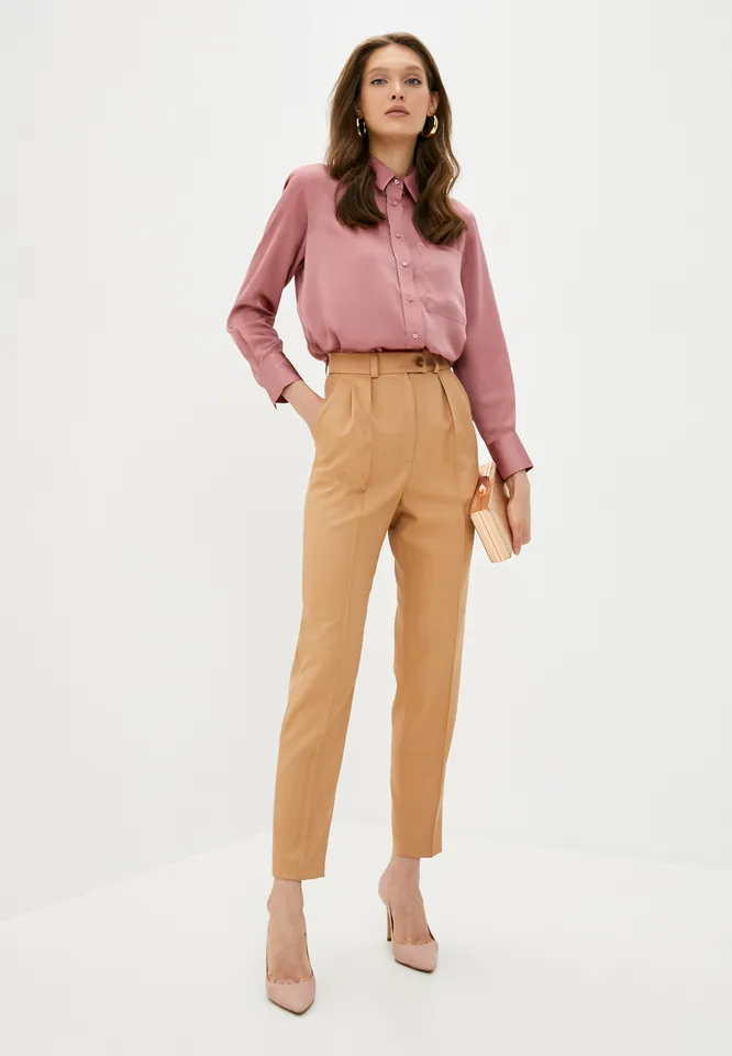 По-прежнему актуальны расклешенные брюки. Мы выбрали модель нежно-розового цвета. Они легко впишутся как в повседневные, так и в вечерние луки.