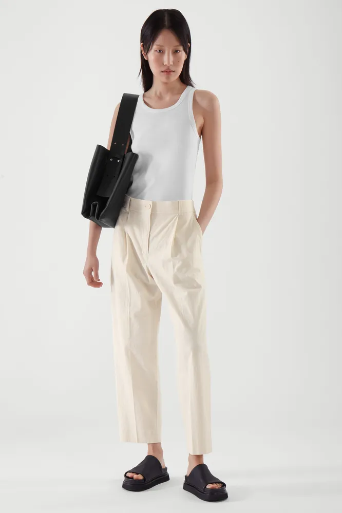 Классические брюки с защипами — универсальная модель, которую можно носить и с футболками, и со строгими блузками, и с укороченными летними топами.