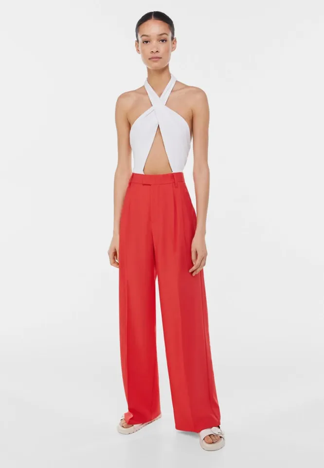 Если ищешь что-то эффектное и яркое, выбирай красные брюки палаццо. Они скроют широкие бедра и гармонизируют пропорции фигуры. Дополняй их облегающим топом и фактурной сумкой.