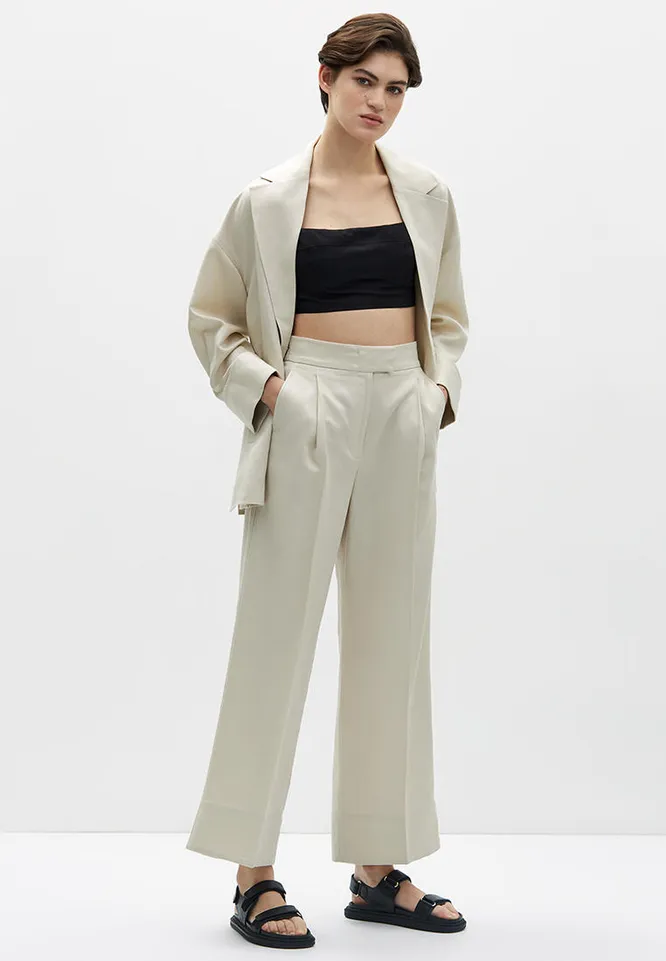 Поклонницам минимализма стоит обратить внимание на нейтральные бежевые брюки. Предлагаем носить их с топом бандо и свободной льняной рубашкой.