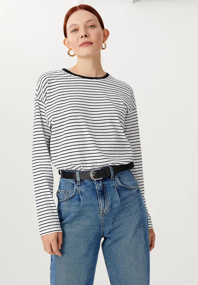 Если хочешь создать комфортный расслабленный лук, сочетай полосатый лонгслив с широкими трикотажными брюками или летящей юбкой миди.