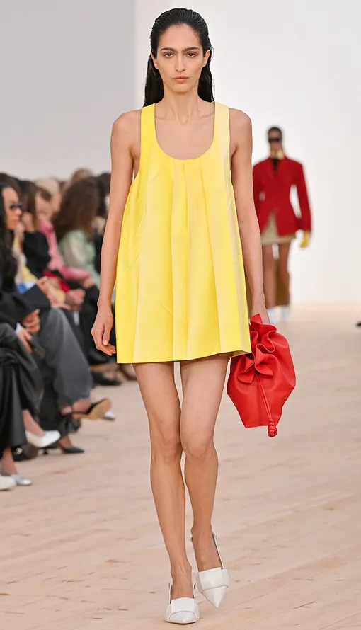 Кстати о визуальной чистоте – актуальны и платья максимального простого кроя. Конкретно – мини-трапеции. И нет, они не выглядят скучно: ситуацию спасает интересная фактура (например, кожа) или крупные драпировки.