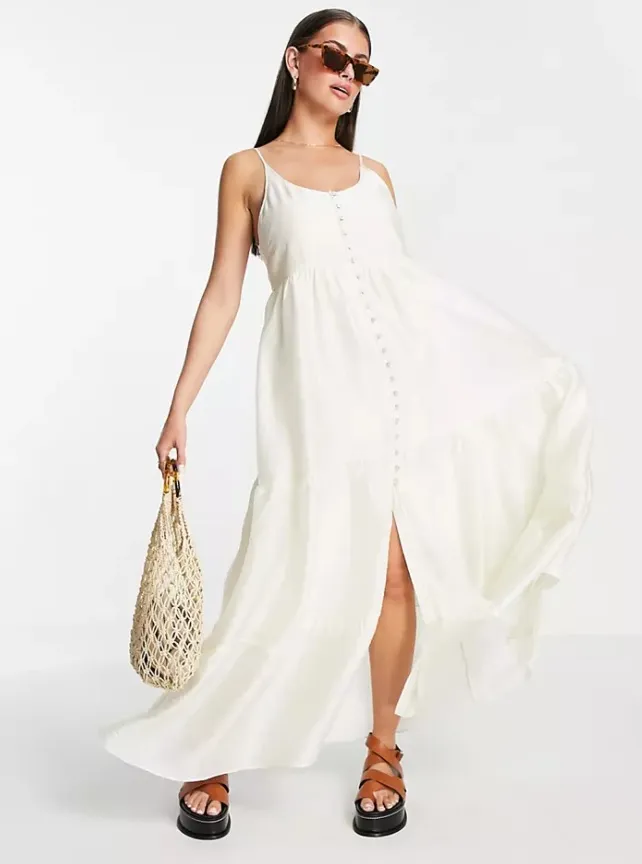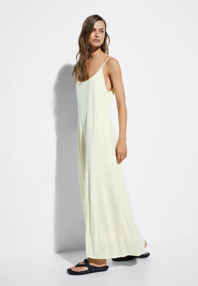 Нежное кремовое платье-комбинация легко впишется как в повседневные, так и в вечерние образы. В первом случае можно носить его с сандалиями и плетеной сумкой, во втором — с изящными босоножками и фактурным клатчем.