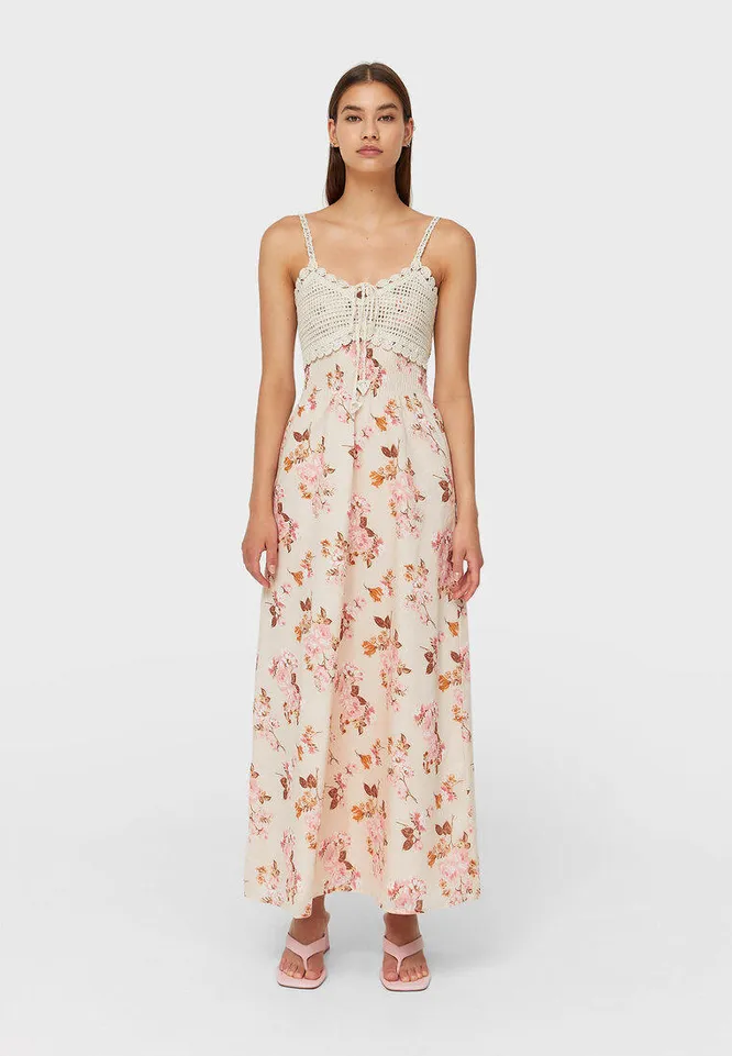 Комбинированное платье-сарафан — мастхэв для жары. В нем можно пойти и на свидание, и на прогулку в парк, и на модную вечеринку. Верх платья, выполненный в технике кроше, и нежный цветочный принт придадут образу легкость и романтичность.