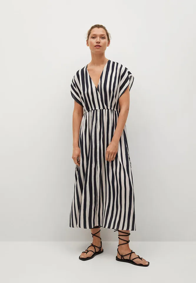Легкое платье в вертикальную полоску станет отличной основой для модного летнего образа. С ним одинаково хорошо смотрятся как нейтральные, минималистичные аксессуары, так и более яркие, трендовые. Например, это могут быть серьги-подвески с цветными камнями.