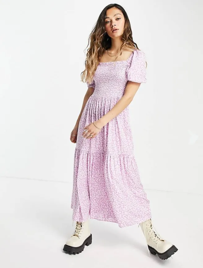 Хит сезона — платье в цветочек с квадратным вырезом и объемными рукавами. Отлично смотрится и с кроссовками, и с аккуратными босоножками, и с комфортными сандалиями.