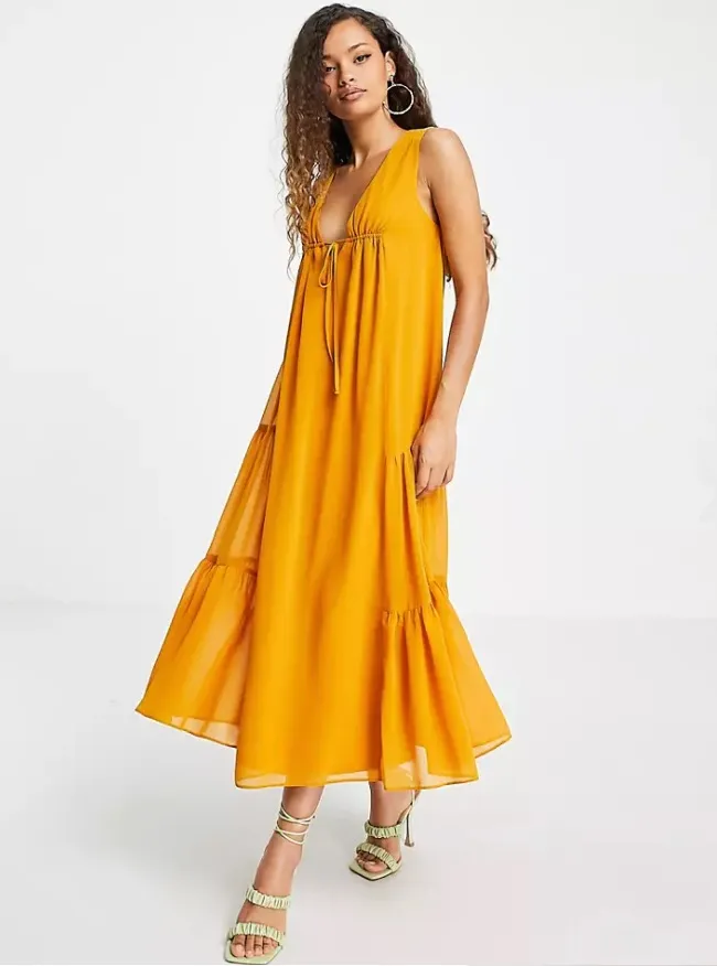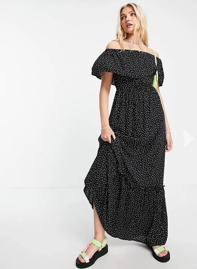 Универсальный вариант на каждый день — ярусное платье с большой оборкой на груди. Мы выбрали вариант с актуальным летним принтом — мелким горохом.
