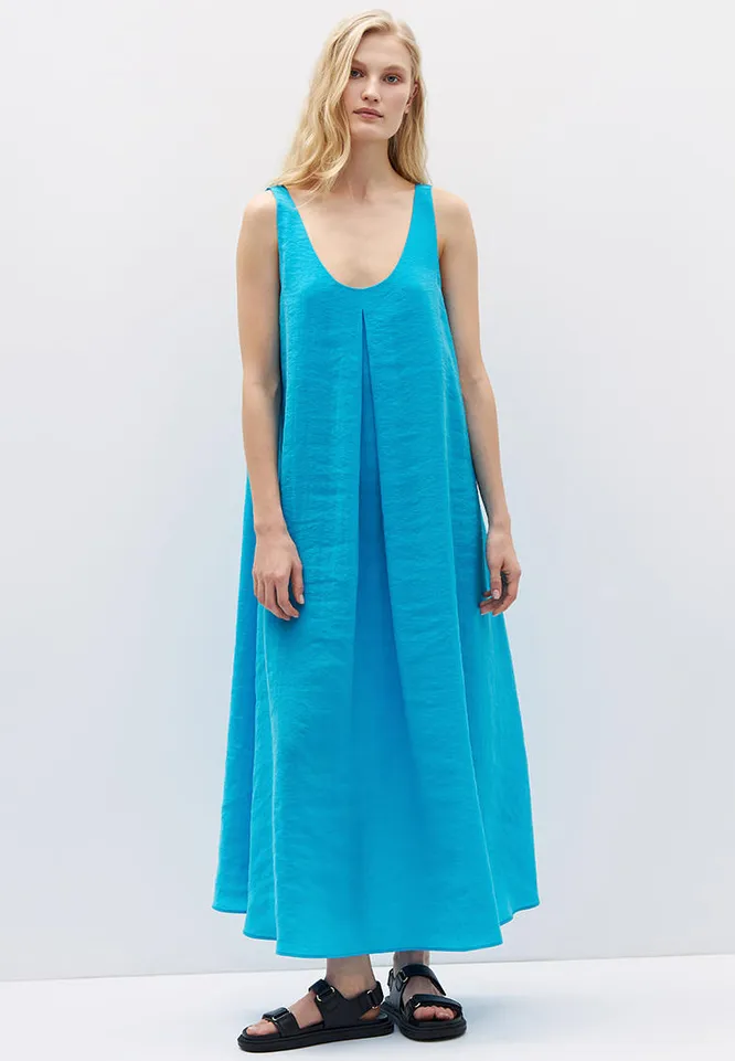 Если хочешь быть в центре внимания, выбирай ярко-голубой сарафан. Свободный крой, легкий материал — то что нужно на лето!