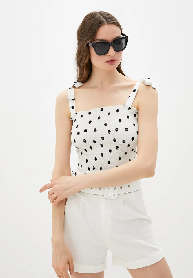 Топ в горох сочетай с плиссированной юбкой миди и обувью на каблуке — получится элегантный женственный образ, в котором можно пойти в театр или на свидание.