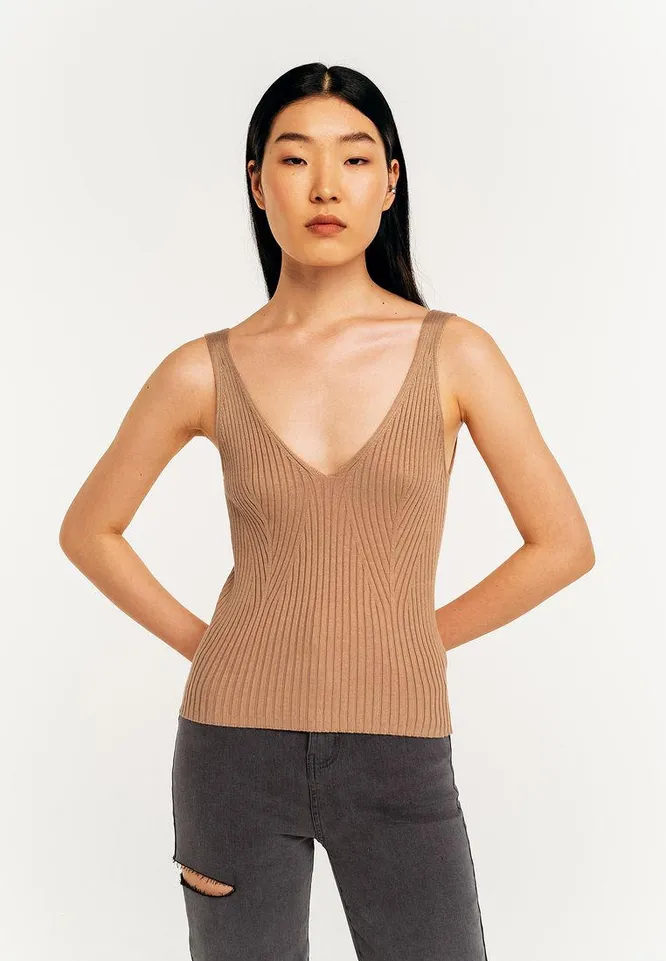 Базовый вариант на все случаи жизни — бежевый топ в рубчик. Модель отлично смотрится как соло, так и в тандеме с рубашками, жакетами, куртками.