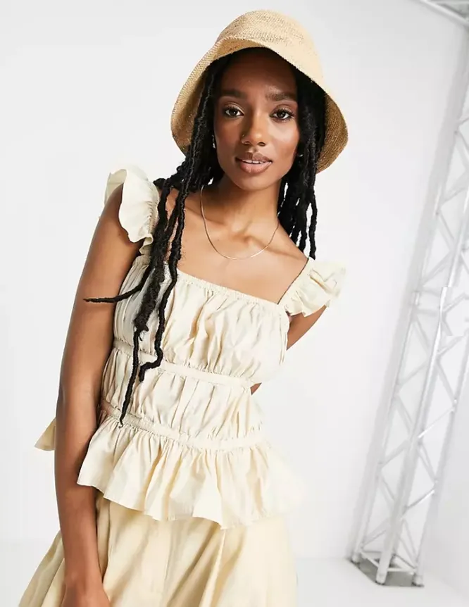 Для романтичных аутфитов выбирай кремовый топ со сборками и оборками. Можно дополнить его мини-юбкой с цветочным принтом или легкими шортами с высокой посадкой.