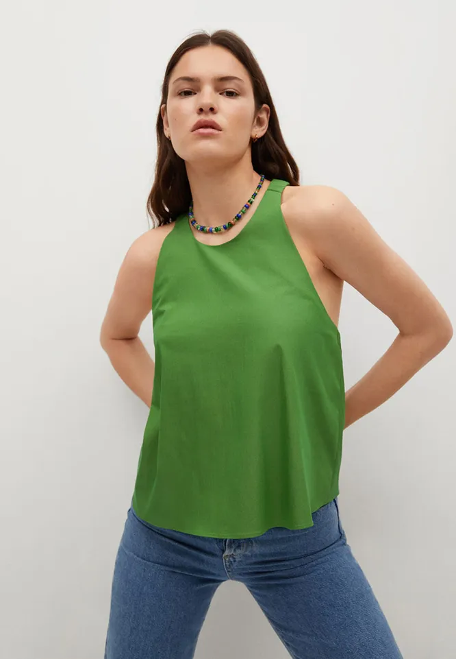 Травянисто-зеленый топ станет яркий акцентом в любом летнем образе. Предлагаем носить его с белыми брюками или джинсовыми шортами.