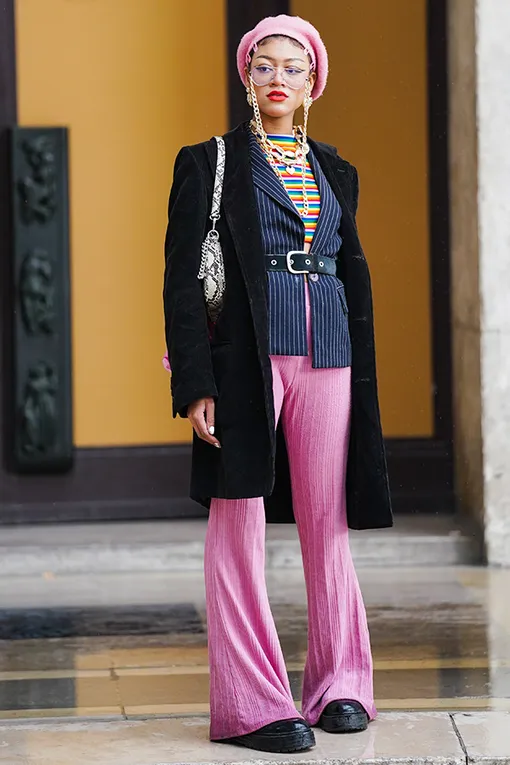За счет длины и расширения брючин они создают красивый силуэт песочных часов и вытягивают рост, что автоматически скрывает пару лишних килограммов. Также клёш может уравновесить тяжелые бедра и создать баланс. Один из моих любимых образов: клеш + оверсайз базовая футболка + жакет/кардиган + золотая цепочка.