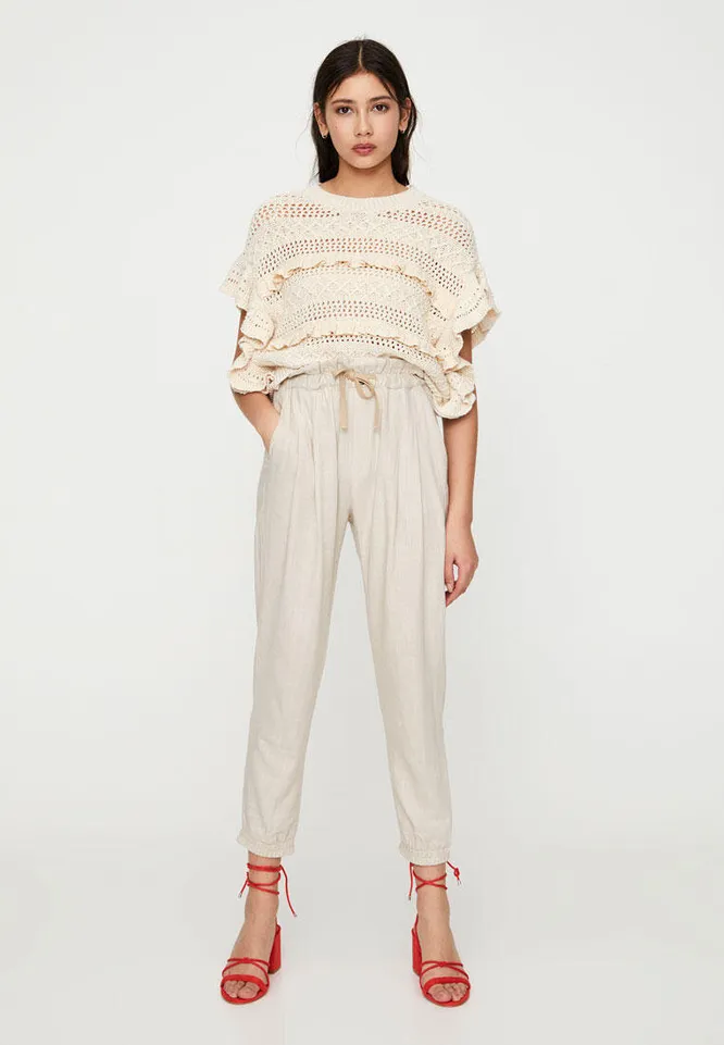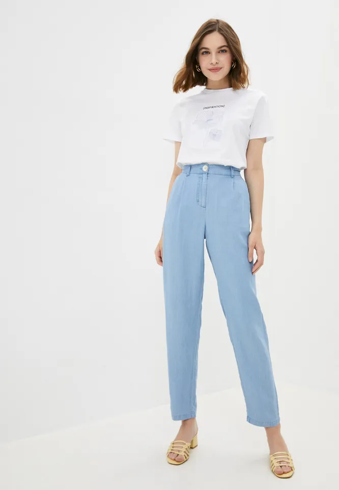 Высокая посадка, прямые штанины, отсутсвие лишних деталей и спокойный, мягкий оттенок — все это в совокупности дает нам эффект длинных, стройных ног и изящных, женственных бедер. Советуем подобрать наверх свободный, но не объемный топ или футболку, заправив край за пояс, и дополнить наряд лаконичными босоножками. Отличный способ создать нежный, элегантный образ и добавить композиции легкости.