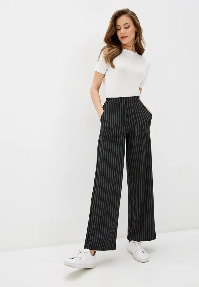 Еще один способ визуально скорректировать силуэт — носить брюки в вертикальную полоску. Важно, чтобы узор был не слишком частый, широкий и контрастный, иначе мы можем получить обратный эффект. Сделай выбор в пользу тонких, не ярких полосок, высокой посадки и штанин в пол — идеальный результат тебе гарантирован!