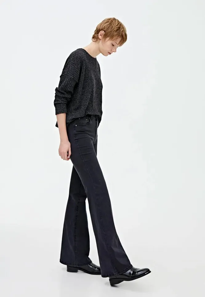 Черные модели хороши тем, что подойдут даже для похода в офис. Правда, не каждый дресс-код это позволяет. Но если у тебя на работе действую не слишком строгие правила в плане формы, то можешь смело выбирать черные джинсы-клеш.