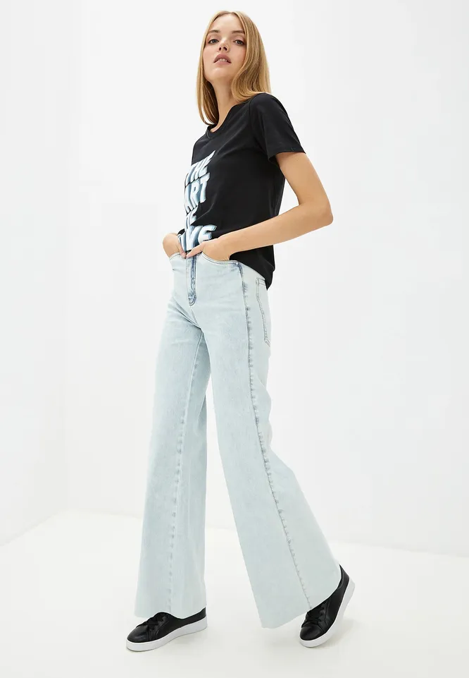 Светлые джинсы-клеш носи с яркими объемными свитерами зимой и футболками с рисунком — летом. Дополняй образ кроссовками на толстой подошве, тем самым визуально прибавляя сантиметров к росту.