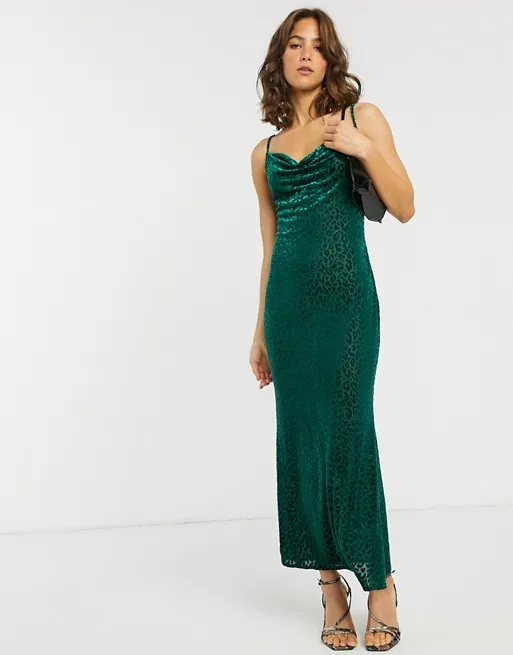 Что может быть проще и сексуальнее, чем платье-комбинация. Нашли для тебя модель насыщенного зеленого цвета, декорированную леопардовым принтом, смотрится такой вариант одновременно дерзко и элегантно. Дополняем образ босоножками-невидимками и маленькой сумочкой на плечо в стиле 90-х (присмотреть такую сумочку ты можешь здесь).