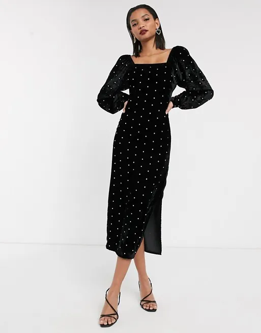 Если не знаешь, какого цвета выбрать платье, покупай черное: с ним не прогадаешь. Такая модель будет гармонично смотреться на девушке любого типа внешности, к тому же темная ткань, как известно, имеет свойство стройнить. Выбранная нами модель декорирована круглыми стразами по всей длине. Прямой крой, квадратный вырез горловины, объемные рукава и невысокий разрез сбоку — такое сочетание деталей в совокупности создает нескучный элегантный образ, который идеально подойдет для новогоднего корпоратива.