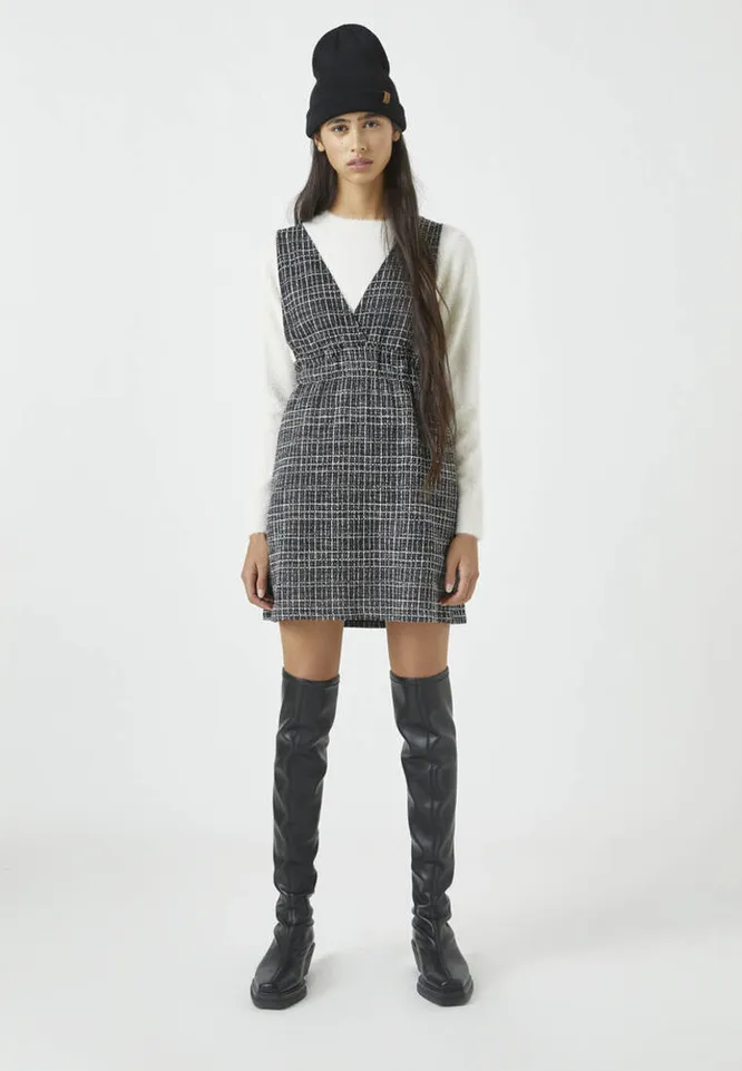 Клетчатый мини-сарафан поможет тебе разнообразить образы в холодное время года. Надевай его с теплыми водолазками с высоким воротом и дополняй наряд ботфортами со свободным голенищем. Для работы или учебы подбирай водолазки нейтральных оттенков, а для особых выходов смело играй с цветом, делая ставку на самые яркие модели.