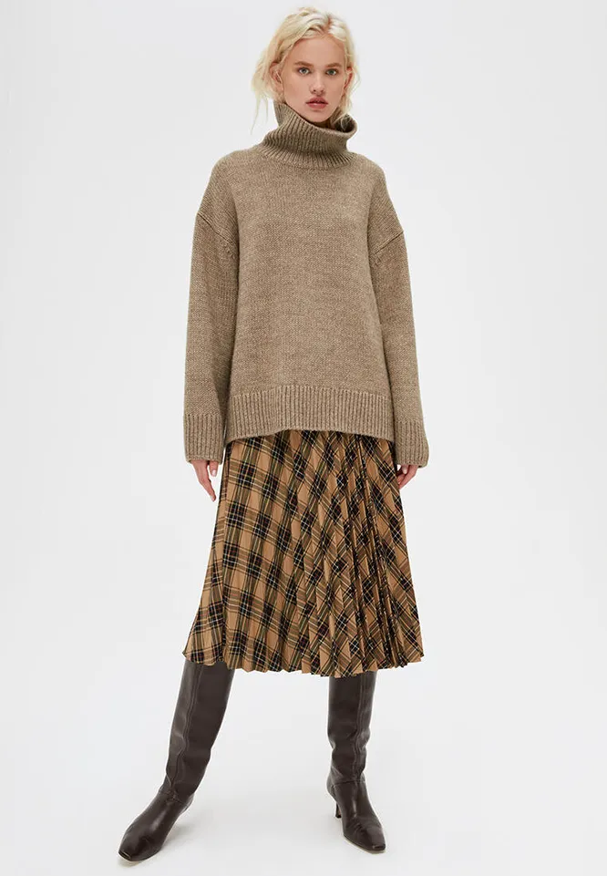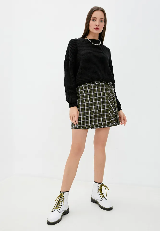 Актуальна не только мини длина, но и модели ниже колена. По-прежнему остается в тренде плиссировка. Плиссированная юбка с асимметричным клетчатым узором послужит нескучной базой для повседневных образов с нотками романтики. Лучшую пару ей составят мягкие кашемировые свитеры и водолазки, блузки с пышными рукавами и даже худи. Очень внимательно подойди к выбору обуви — длина миди довольна капризная и требует тщательной проработки образа. Лучшим вариантом станут высокие сапоги с широким голенищем, уходящий под подол. Не менее интересно в таком сочетании будут смотреться грубые ботинки или ботильоны, только следи, чтобы они заканчивались в районе щиколотки, но не выше. В противном случае ты будешь визуально резать ноги и подчеркивать объем в икрах.