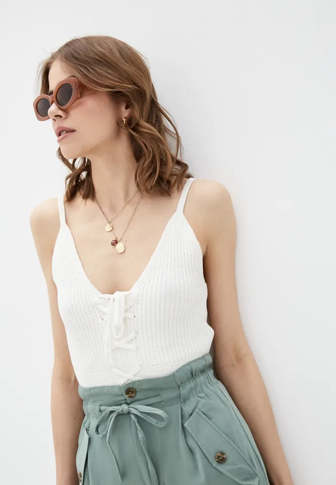Базовый вариант — белый вязаный топ в рубчик на тонких бретелях. Можно носить его соло или надевать под жакеты, кимоно, легкие накидки и оверсайз-рубашки.