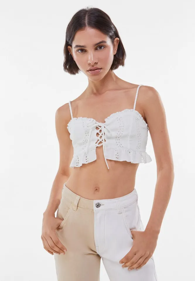Сексуальный, но в то же время нежный и инфантильный кроп-топ с завязками и вышивкой ришелье будет стильно смотреться с элегантными брюками палаццо, джинсовыми шортами в винтажном стиле или пестрыми мини-юбками.